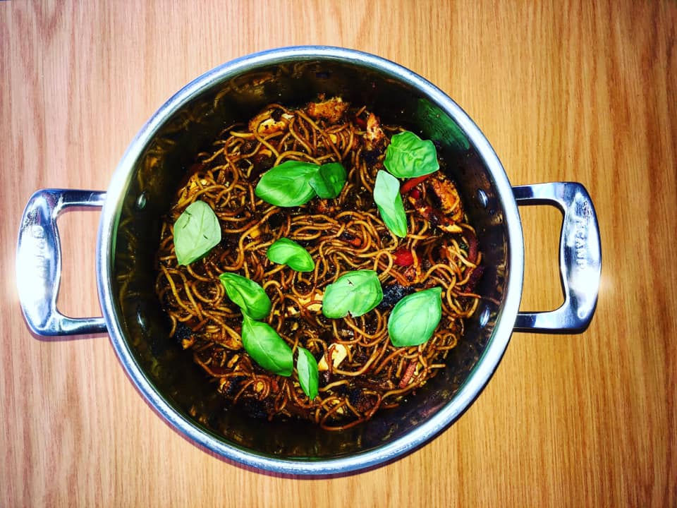5. Once all your veggies are cooking and sizzling away add some mixed veg spice and soya sauce for taste and turn the heat down to low. Add in your chicken breasts and cooked egg noodles and mix.