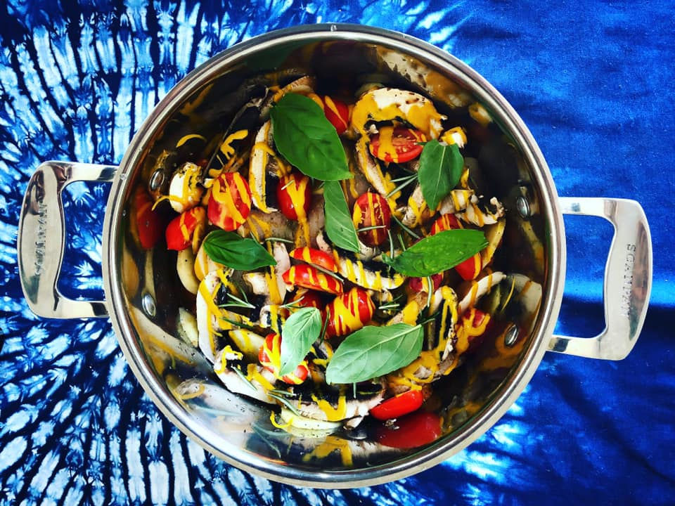 4 x chicken breasts 125g x plum tomatoes, sliced 1 x large potato, sliced in rings 4 x small carrots 2 x garlic cloves, sliced 3 x tbsp balsamic vinegar 4 x tbsp virgin olive oil 125g x brown mushrooms, sliced Lemon & garlic salt to taste 100ml good quality white wine 2 x sticks rosemary 5 x fresh basil leaves Mustard sauce